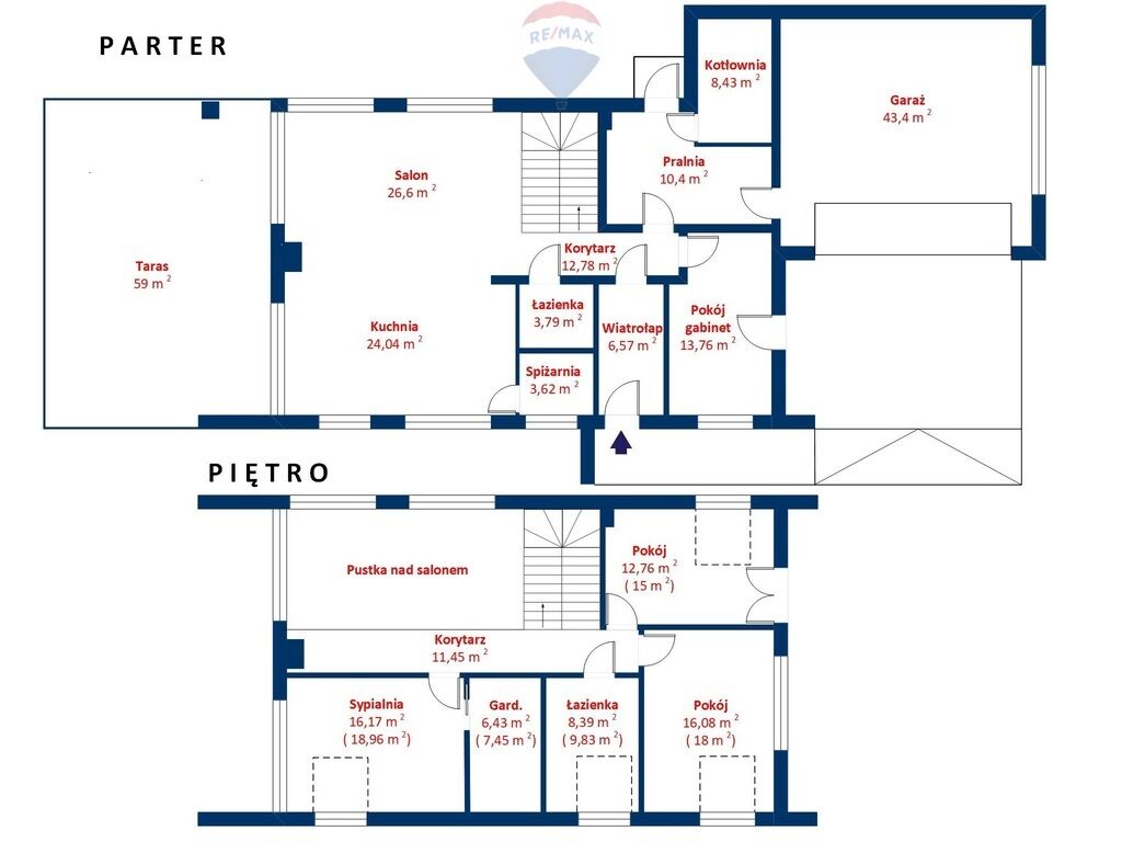 • PIĘTRO: 3 sypialnie (19, 18 i 15 m2); łazienka z wanną i WC;