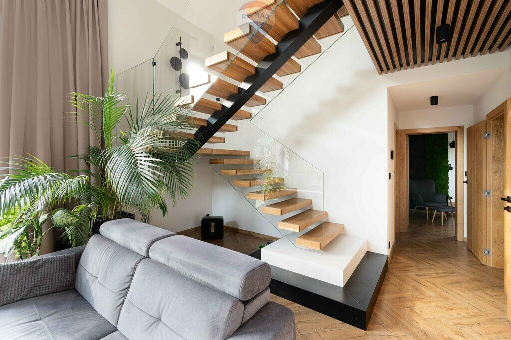 • na piętro prowadzą nowoczesne schody dębowe ze szklaną